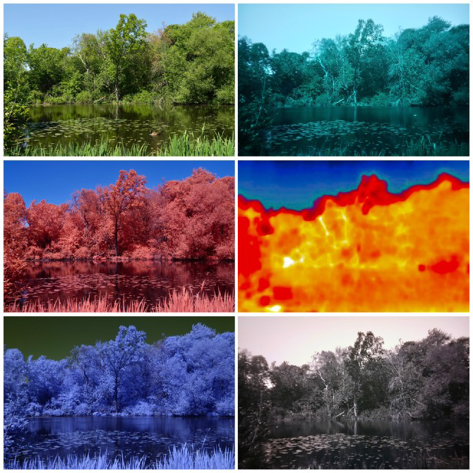 SIX SPECTRAL VIEWS, each a separately acquired photograph, of Hall’s Pond: